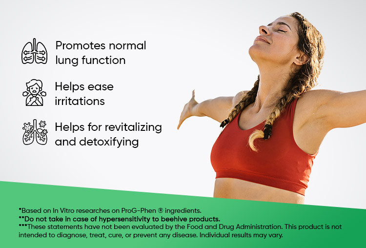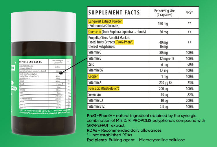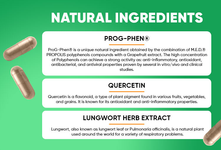 Το εκχύλισμα Lungwort αποτοξινώνει, η Quercetin ανακουφίζει από τις αλλεργίες και το ProG-Phen® καταπολεμά τη φλεγμονή. Μαζί, προσφέρουν μια ασφαλή και αποτελεσματική λύση για την αναπνευστική υγεία.