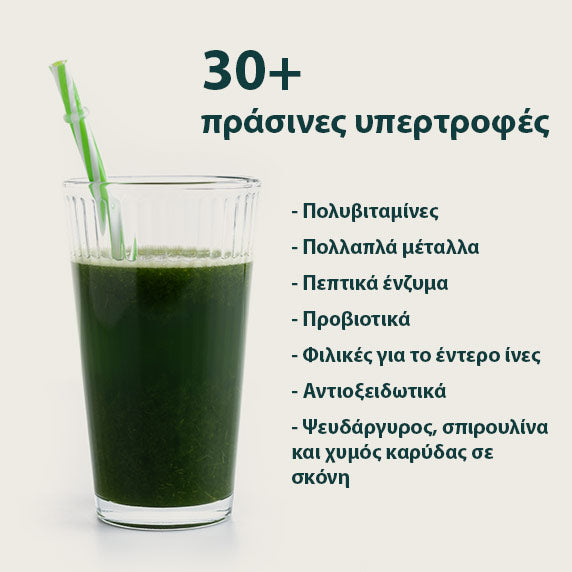 Γεμάτα με 30+ υπερτροφές, προβιοτικά, πεπτικά ένζυμα, βιταμίνες και μέταλλα που βοηθούν την ανακούφιση από το φούσκωμα, ενισχύουν την ενέργεια και περιορίζουν τις λιγούρες, υποστηρίζοντας το ανοσοποιητικό, την επιδερμίδα και τα μαλλιά.