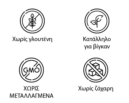 Χωρίς πρόσθετη ζάχαρη, χωρίς πληρωτικά, χρωστικές, μεταλλαγμένα προϊόντα, γλουτένη, σόγια, γαλακτοκομικά, βαρέα μέταλλα ή άλλα σκουπίδια.